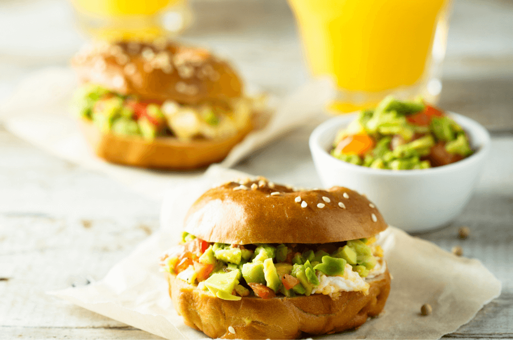 El origen de este pan bagel se sitúa en Polonia y aunque se ha hecho muy popular en países como Estados Unidos, Reino unido o Canadá, se le suele acompañar con aguacate, salmón ahumado, huevos revueltos inclusos remolacha rallada. Aunque es esta ocasión solo utilizaremos queso crema, pan, bagel, aguacate, tomate, sal, pimienta, mantequilla amarilla y crema de leche.