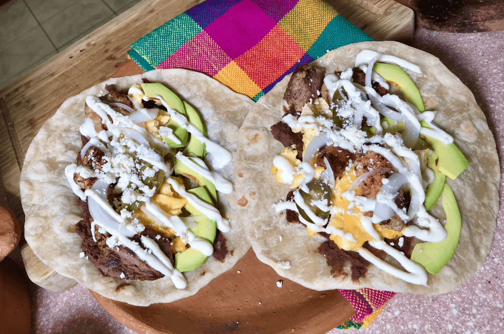 - Armar la baleada con los frijoles, huevo con chicharrones, mantequilla crema Leyde, el aguacate y el queso semi seco Leyde rallado. Servir.
