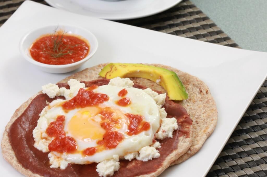 - Al servir untar frijoles sobre 1 tortilla de harina integral, agregar otra tortilla, requesón, el huevo, 1 rodaja de aguacate y salsa ranchera al gusto.