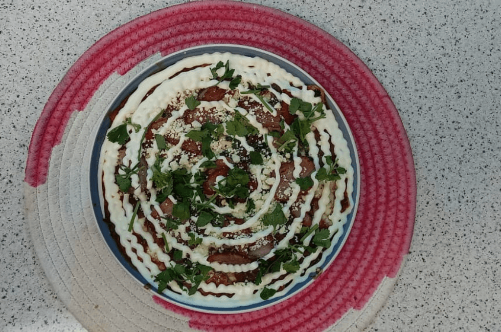 - Precalentar el horno a 400 ºF, colocar en una bandeja profunda mediana la mitad de las tortillas, rallar la mitad del quesillo terminando con el resto de tortillas y quesillo, mezclar el caldo de pollo con los frijoles y verter encima.