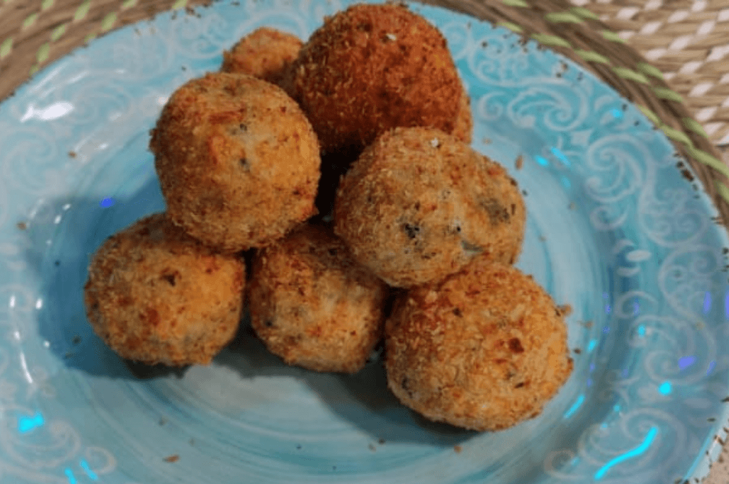Para hacer el plato aún más interesante, las bolitas van rellenas con quesillo y arroz; la harina, huevo y panko los usamos para el exterior. Son ideales para llevar a la oficina, como aperitivo, para compartir en un picnic al aire libre, como tentempié para que los niños lleven al colegio, etc. Tanto calientes como frías, quedan sabrosas.