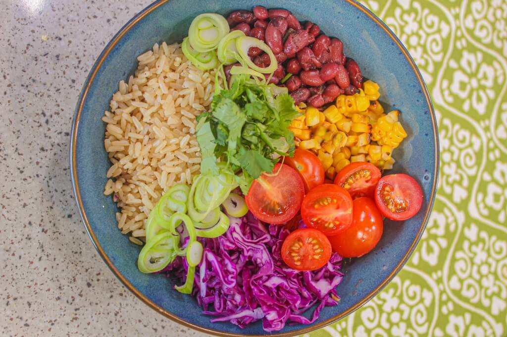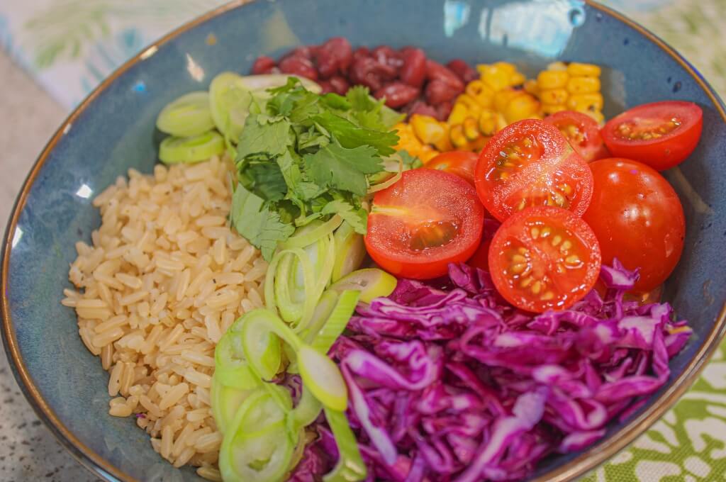 - Sobre una lonchera, o pírex de vidrio para llevar colocamos una base de arroz integral cocido; seguido de ello sobre la superficie de la base del arroz, servimos agrupado en orden el frijol, el maíz desgranado, el tomate cereza, la cebollina, el repollo y el culantro. Tapamos y refrigeramos, o servimos al momento con la proteína al gusto.