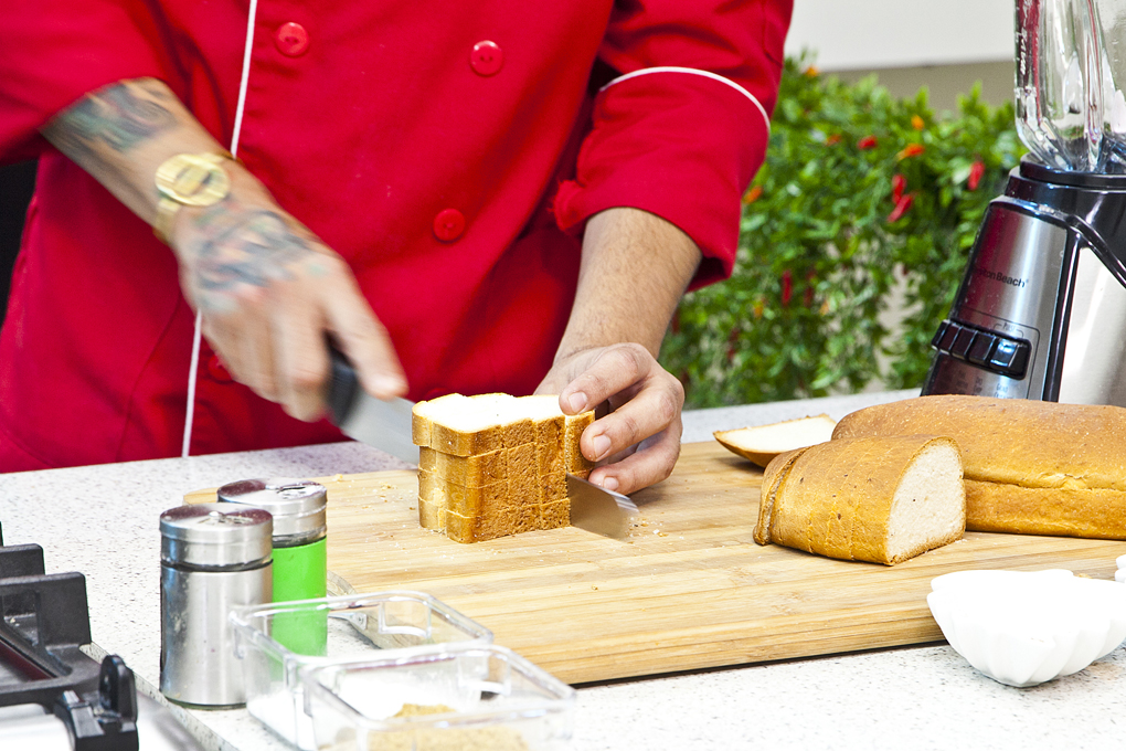 - Precalentar el horno a 350 ºF, cortar el pan en cubos medianos, licuar los huevos con la leche evaporada, leche, canela, dulce de rapadura, fécula de maíz y nuez moscada.