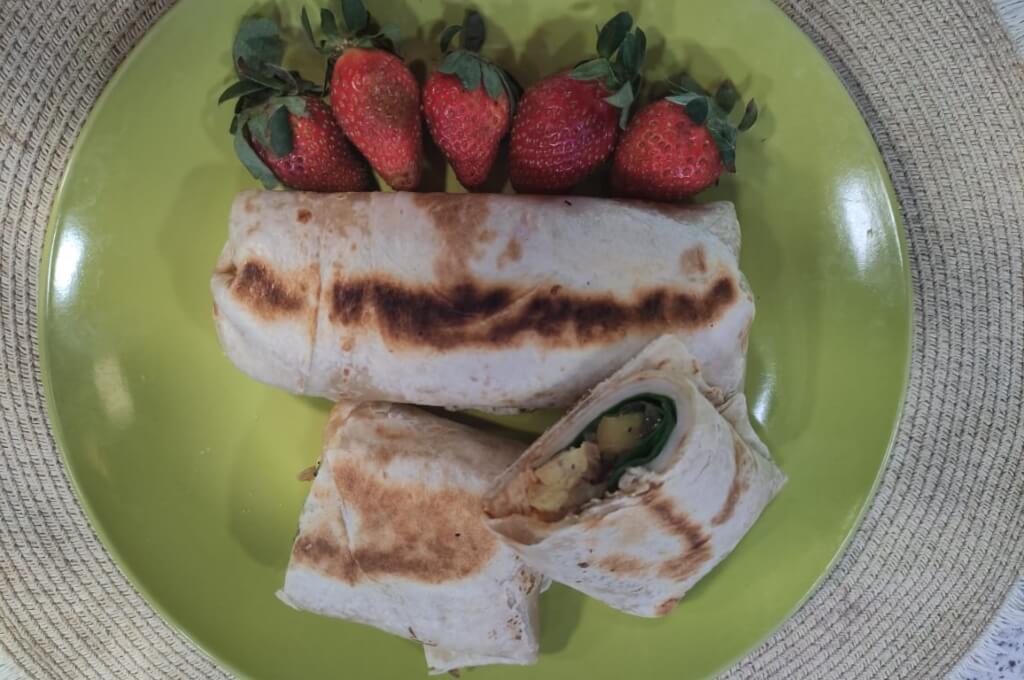 - Sobre las tortillas precalentadas colocamos una cama de espinaca y jamón, 2 cucharadas de zucchini salteado, una porción de huevo y 2 cucharadas de queso mozzarella, enrollamos el burrito, cocinamos sobre el comal hasta tostar y servimos.