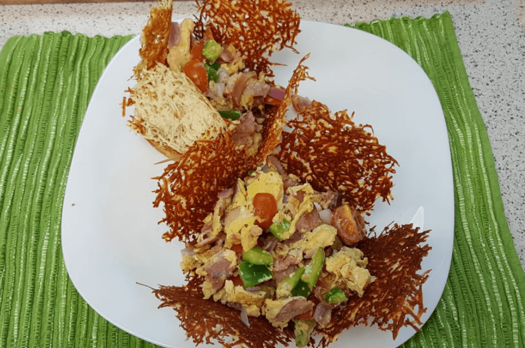 Será necesario utilizar un vaso resistente al calor, sacar el emparedado con el queso y colocar encima del vaso, dejar que se enfríe y así se forman las canastas. Ya luego solamente cocinas el relleno, que en este caso es huevos revueltos con vegetales y tocino.