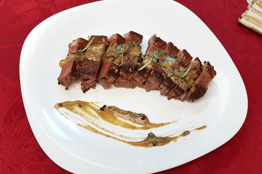 - En la misma sartén agregar el ajo aplastado, rama de romero entero y pimientas, saltear todo por 2 minutos y agregar el caldo de res dejar reducir por mitad y agregar la crema para batir, dejar espesar y servir como salsa sobre la carne.