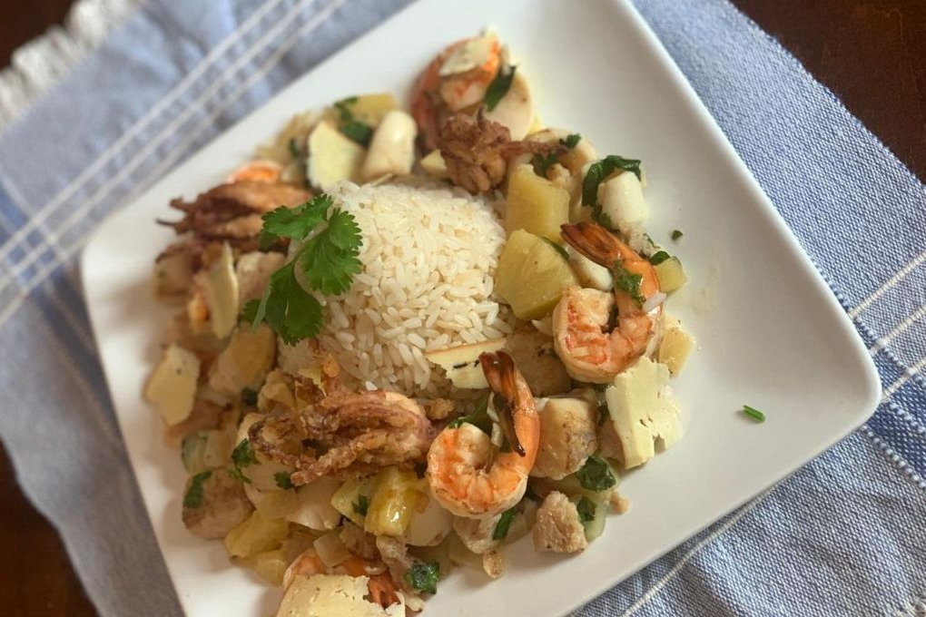Deliciosa cazuela tropical con mariscos, servida con arroz blanco.