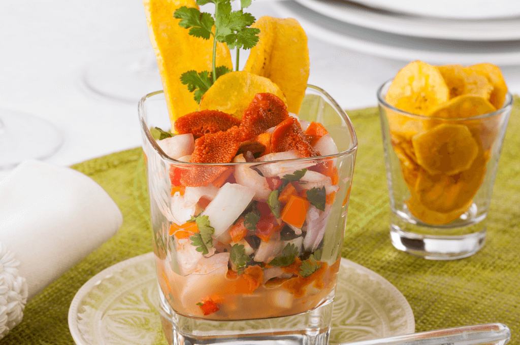 Por supuesto que el limón no puede faltar, es el ingrediente final para darle el sabor cítrico al ceviche. Por supuesto, el acompañante de este ceviche también es importante, así que te recomendamos que lo puedes servir con tajaditas de plátano fritas, así como chips de yuca o de malanga.