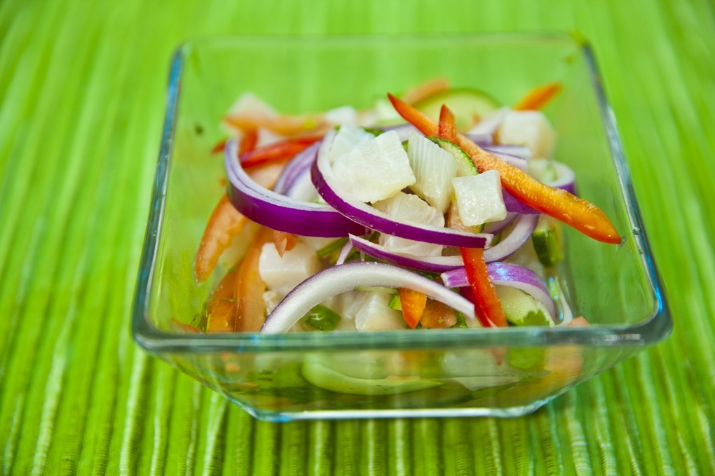 - Cortar la curvina en cubos pequeños y sazonar con sal al gusto, añadir todo el resto de los ingredientes y bañar con el adobo, servir inmediatamente.