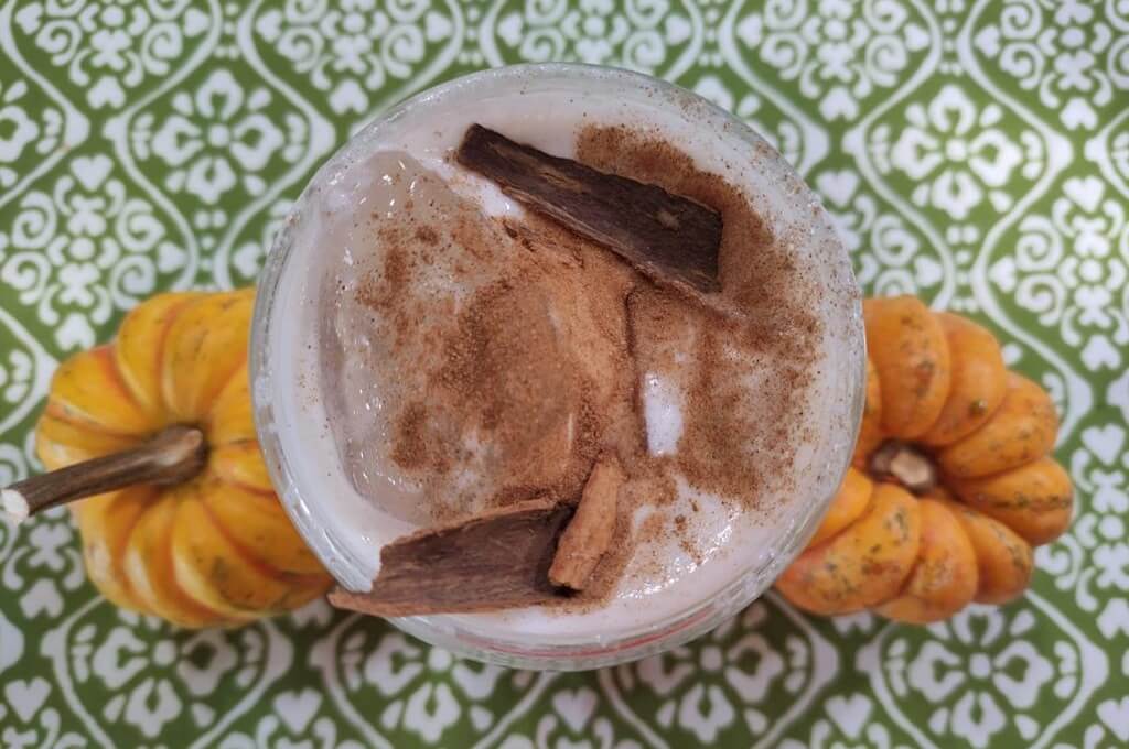 - Licuamos junto con la leche, leche condensada, canela molida, sal y nuez moscada. Si está demasiado espeso, podemos agregar mayor cantidad de leche al gusto. Servimos con hielo al gusto y extra canela.