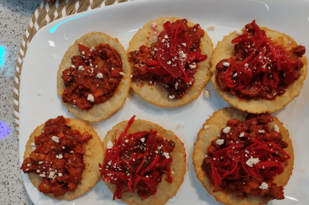 - Sumergir las tortillas en la salsa, y emplatar en plato de profundidad media.