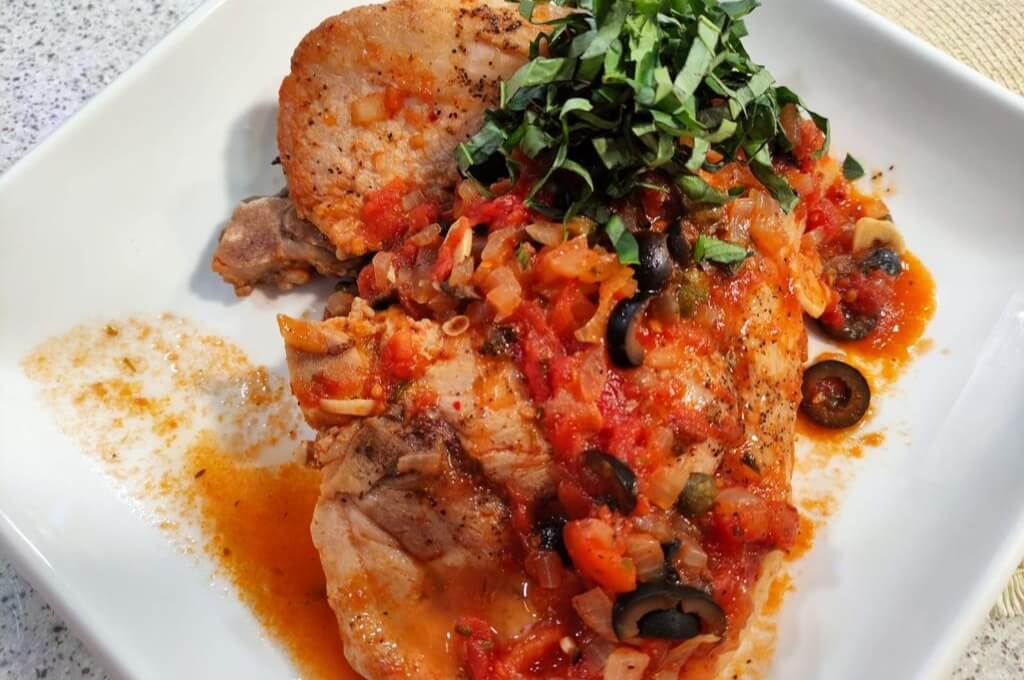 - Sobre la misma olla colocamos a sudar la cebolla el ajo, el orégano, las alcaparras y las aceitunas durante 5 minutos, luego vertemos los tomates sin piel triturados y cocinamos durante 10 minutos más. Una vez pasado este tiempo incorporamos nuevamente las chuletas junto con el chile en hojuelas y la mitad de la albahaca. Tapamos y cocinamos a fuego medio-bajo durante 10 minutos más y servimos con albahaca fresca picada.