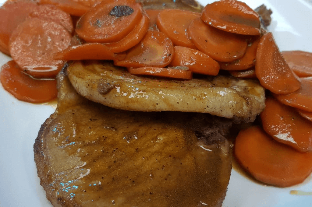 En esta ocasión las chuletas glaseadas se preparan con unas zanahorias en rodaja, creando una fusión de sabores y texturas deliciosas. Algo que se debe tomar en cuenta al momento de hacer esta receta, es que al hacer el caramelizado del glaseado se debe tener cuidado con las temperaturas; ya que como utilizamos azúcar morena, fácilmente se puede llegar a quemar y crear un sabor desagradable.