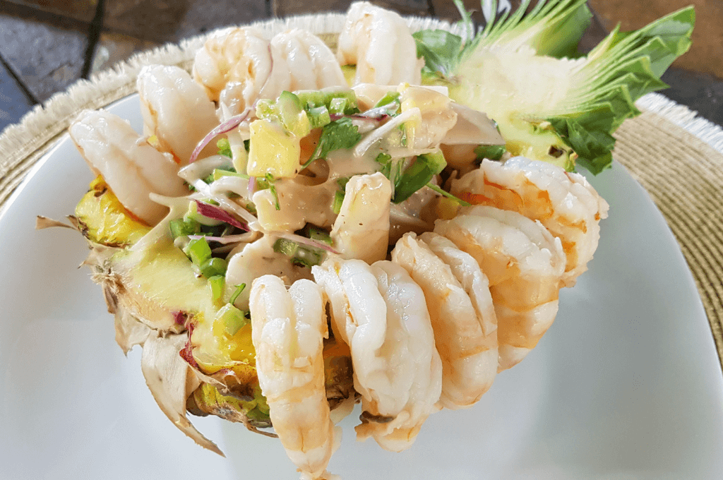 - En un recipiente mezclar muy los camarones con el resto de los ingredientes y servir dentro de la piña, degustar bien frio.