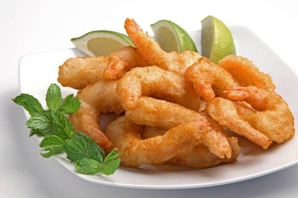 - Calentar aceite en una sartén a temperatura alta. Pasar los camarones por la mezcla de tempura y freír hasta que estén crujientes.