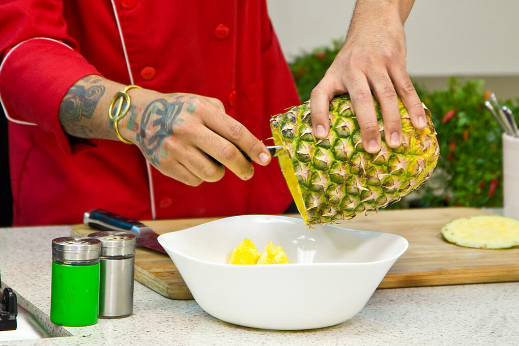 - Cortar ambas puntas de la piña, por la parte superior (donde crecen las hojas), comenzar con un cuchillo cortando la circunferencia hacia dentro de ella con sumo cuidado de no cortar la piel hasta llegar a la parte inferior sin perforarla.