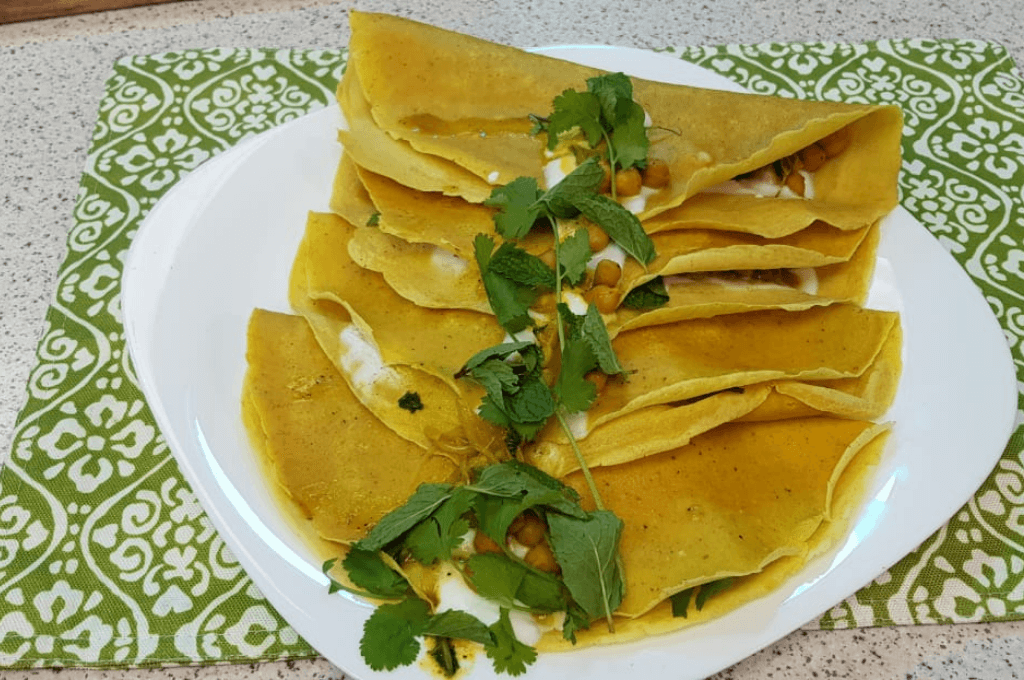 - Rellenar las crepas con los garbanzos y rociar con el cilantro y hierbabuena.