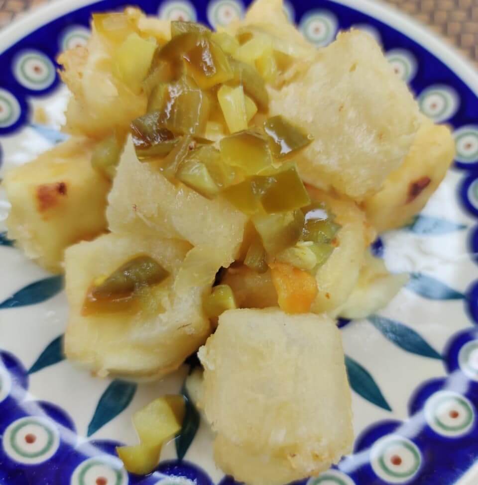 - Precalentar a fuego fuerte el aceite y colocar a freír los cubos hasta estar dorados, retirar y colocar en papel absorbente. Servir con los jalapeños en escabeche.