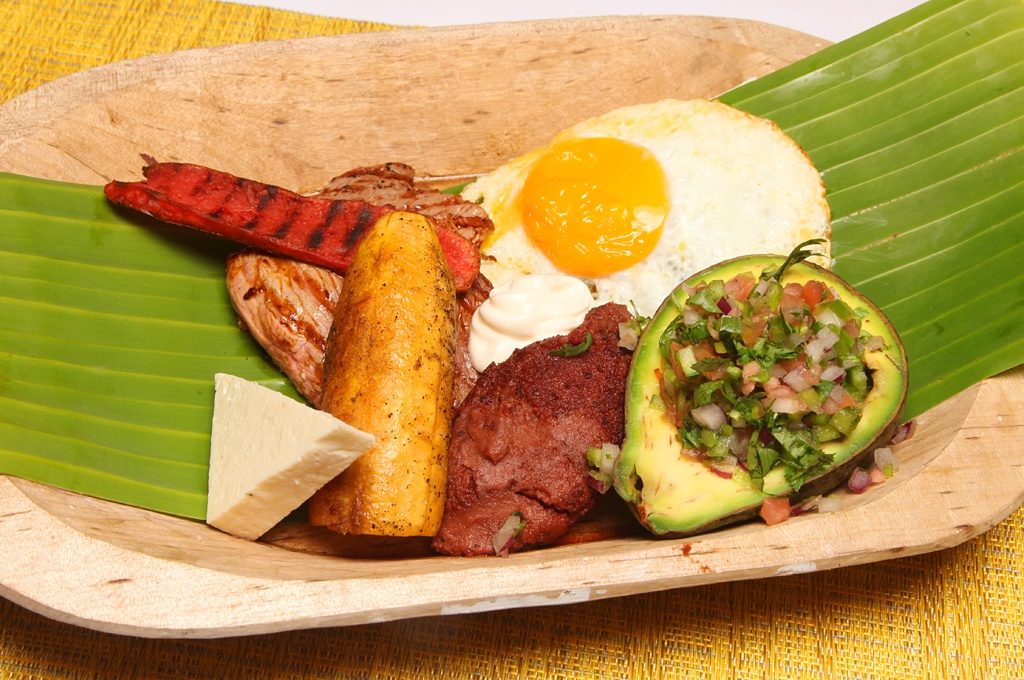 - Montar en el plato el churrasco con el huevo estrellado, tajadas de plátano frito, el chorizo partido por la mitad, frijoles fritos, queso fresco semi seco, chismol y el aguacate.