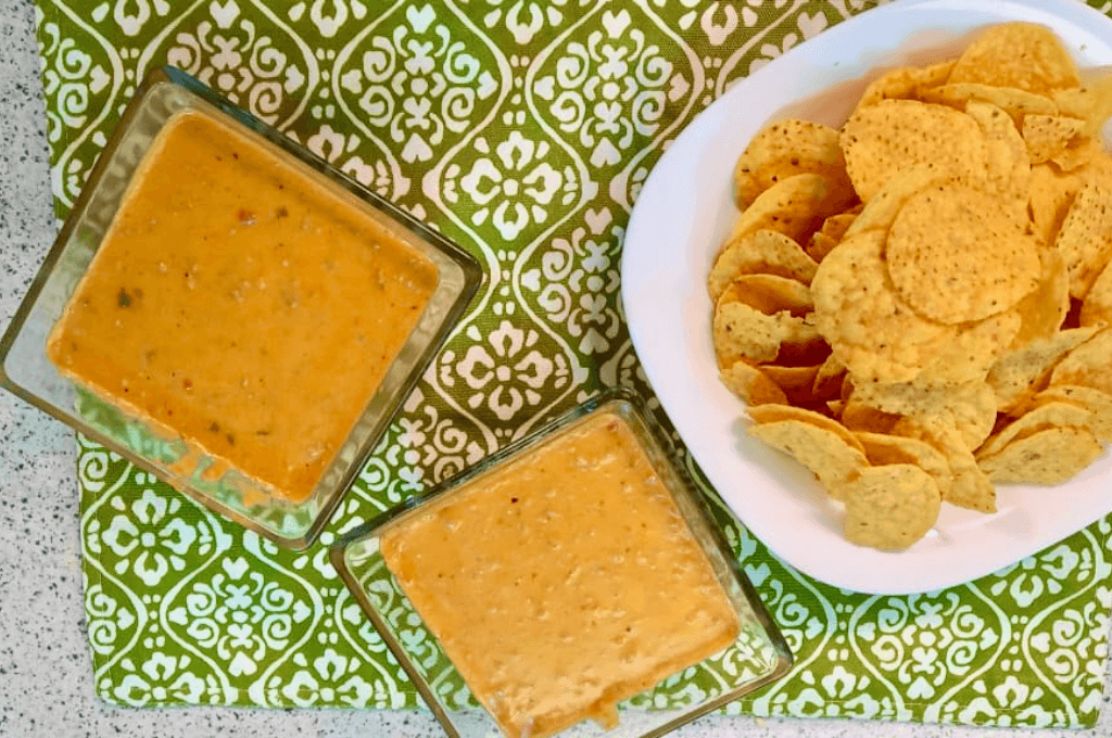 - Terminar con el queso en cubos pequeños, mover muy bien hasta incorporar el queso a la salsa, terminar con sal y pimienta al gusto. Servir con las chips de tu preferencia.