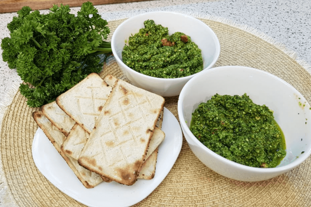Preparación del dip pesto de espinacas y perejil