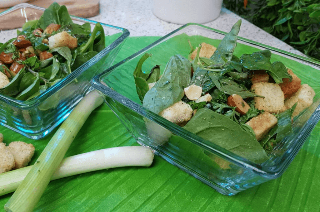 En un recipiente agregar la albahaca previamente deshojada, la albahaca dulce, añadir la espinaca, el perejil finamente picado, agregamos las hojas de cebollines, trocear las almendras y añadirlas a la ensalada. Si no tiene almendras puede añadir cualquier semilla que tenga a la mano, añadir los crotones, mezclar bien antes de aderezar.