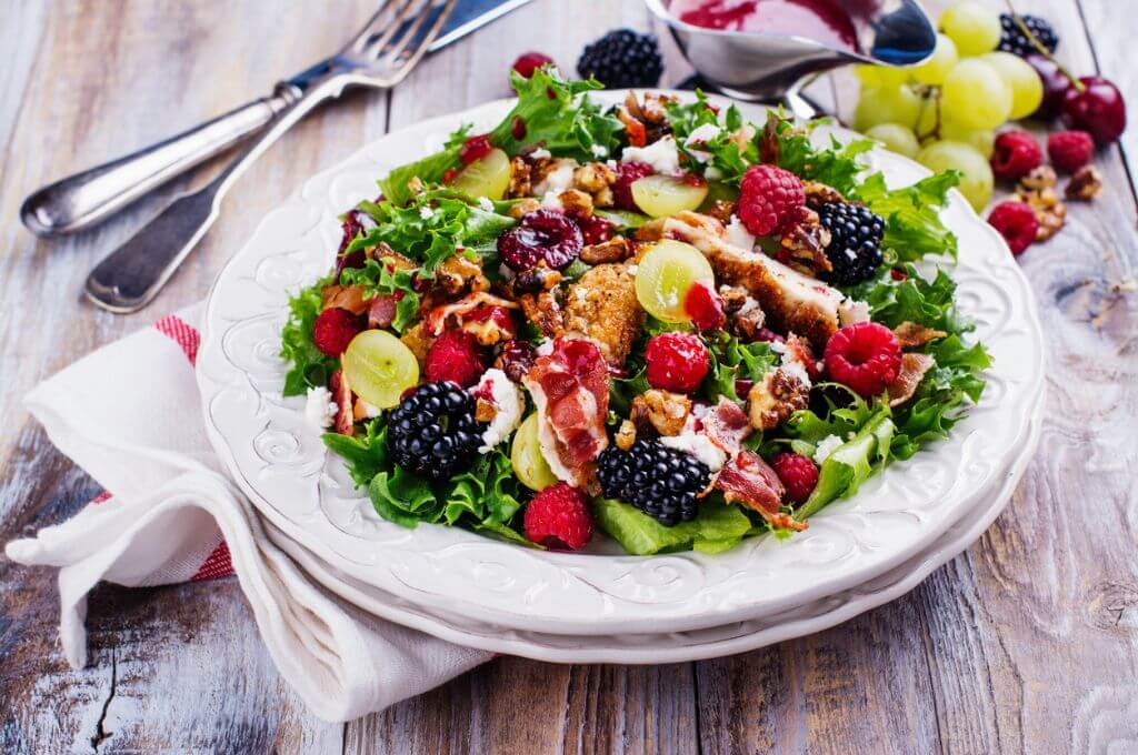 - Agregar los frutos rojos, nueces, el queso y las aceitunas, mezclar. Servir con el sirope de arándanos.
