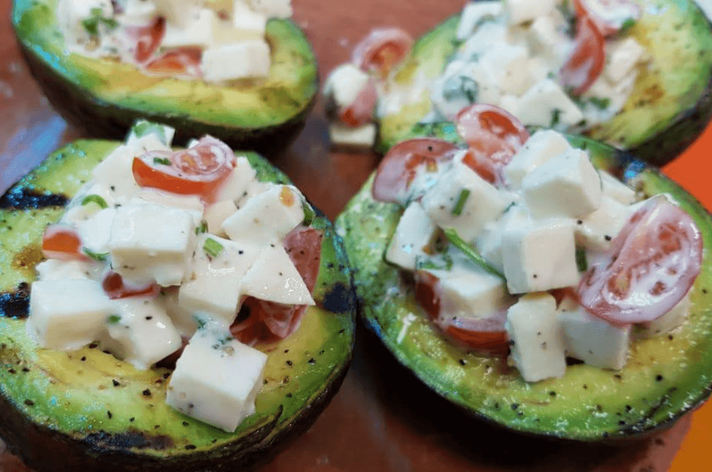 - Colocar las mitades boca abajo en el grill por 2 minutos o hasta marcar los aguacates, retirar y reservar.