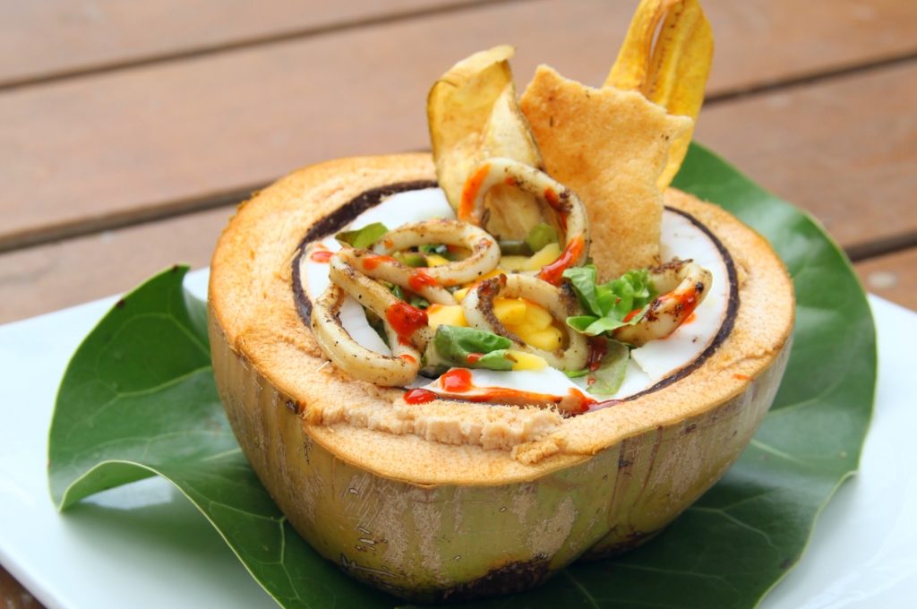 - En un tazón mezclar las lechugas mixtas, el cilantro y el mango. Servir la ensalada en la mitad de un coco. Colocar una cama de lechugas, luego los calamares y rociar con el aderezo de salsa sriracha.