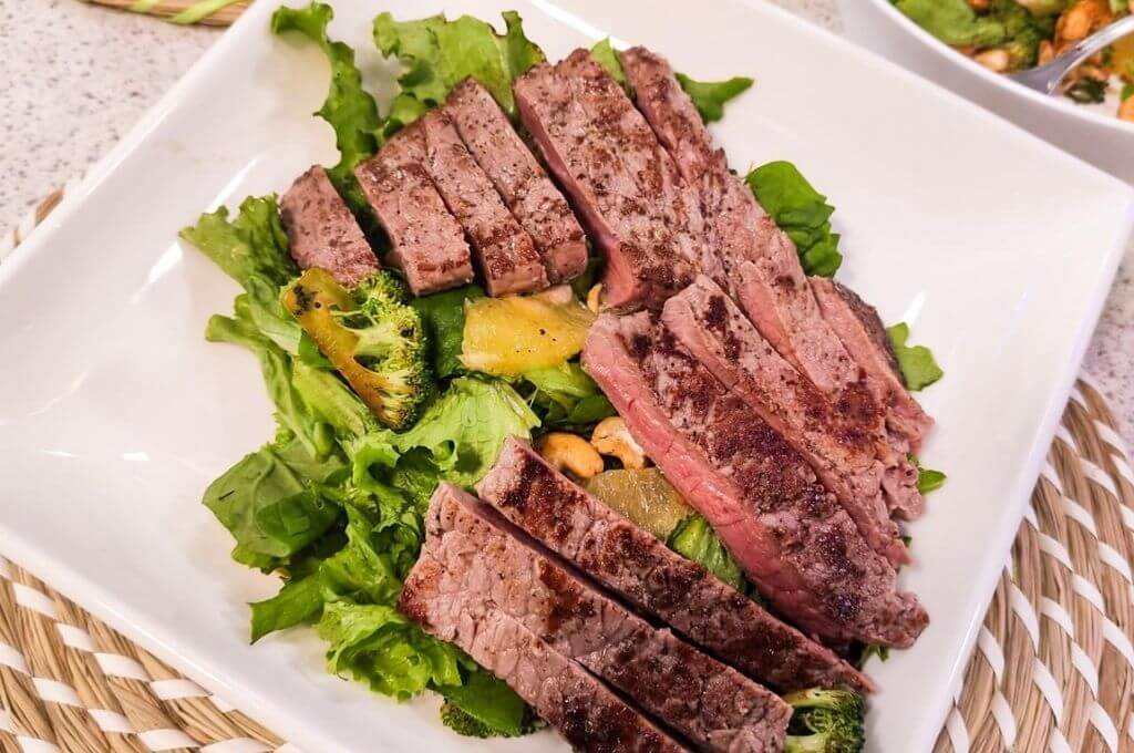 - Servimos una base de la ensalada, con un bistec en tiras sobre la misma y bañando con el aderezo.