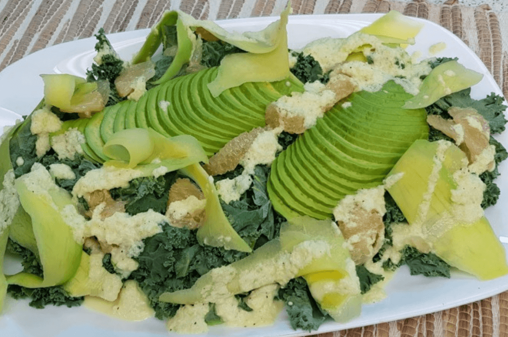 - Para la ensalada, sacar los gajos de toronja y rodajas del aguacate, colocar en un plato encima de las hojas de kale y reservar.