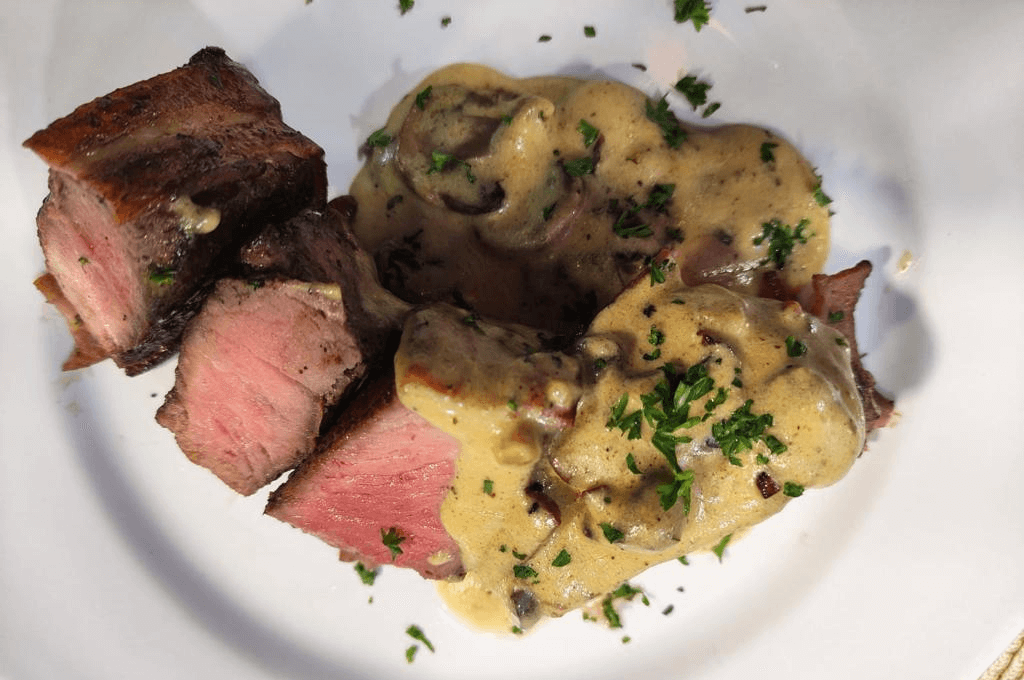 - Sobre la grasa de cocción de la carne salteamos el ajo y los hongos por 1 minuto; agregamos la harina incorporando bien, seguido de la crema de leche y calentamos hasta diluir e integrar todos los elementos por completo y se forme una salsa espesa. Servimos los medallones sin hilo, junto con la salsa de hongos y perejil.