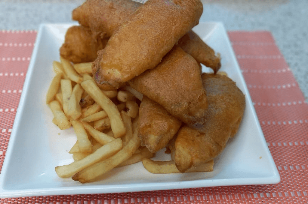 Filete en masa dorada crujiente, servido con una generosa porción de papas fritas calientes y esponjosas.