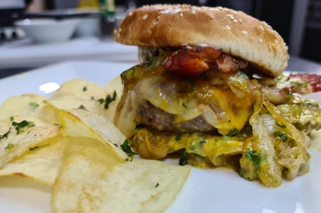 - Para armar, tostar los panes y cubrir con el aderezo, colocar la cebolla caramelizada, una cama de tocino frito, las dos tortas carne con los quesos y en la parte superior añadir los pepinillos, tapar con la otra tajada de pan con el aderezo. Servir las papas y disfrutar.