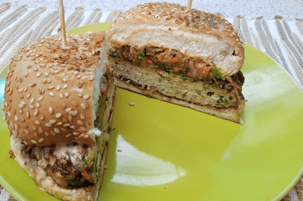 Una hamburguesa estilo thai elaborada con pollo y perfumada con especias y condimentos.