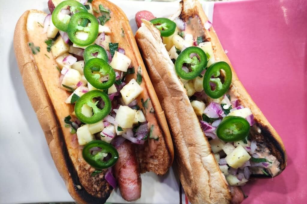 - Revolvemos la piña con la cebolla, la menta, limón, sal y pimienta.Servimos una salchicha rellena sobre cada pan con aderezo, lo terminamos con el picadillo de piña y disfrutamos.