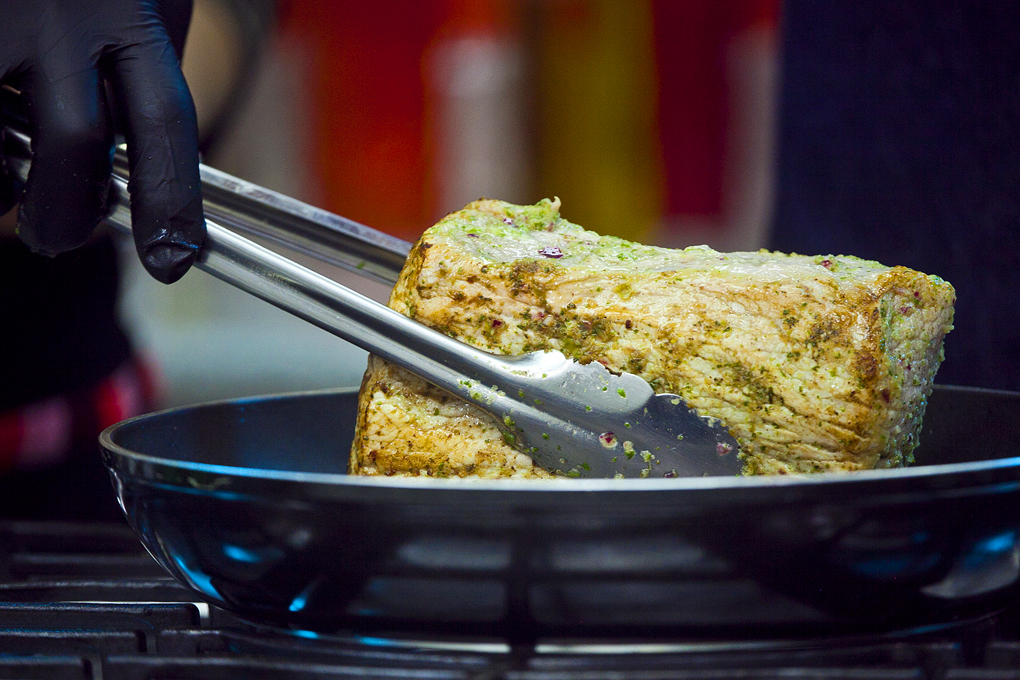 Para conservar los jugos del lomo de cerdo, sellar bien por cada uno de sus lados. Evitar punzar para que los jugos de la carne no se escapen.