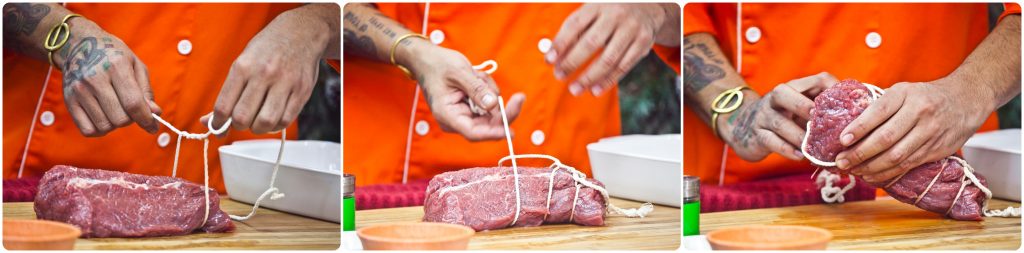 Estos son los pasos para amarrar el lomo de res y que mantenga su forma cilíndrica.