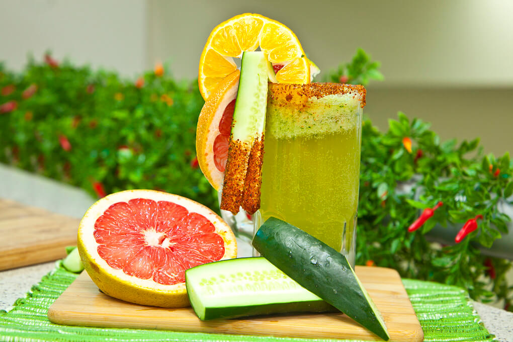 Decora la michelada de pepino con unas rodajas de toronja y pepino en los bordes