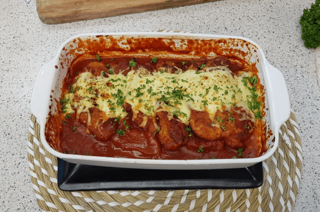 - Precalentar el horno a 450 ºF, en una cacerola para horno o molde verter la salsa, colocar las milanesas de pollo y queso mozzarella encima, llevar al horno por 7 a 10 minutos y servir con un poco de perejil encima.