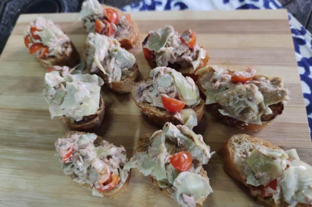Montadito de ensaladilla de atún y alcachofas, una deliciosa receta elaborada por el chef Carlos Espinal.