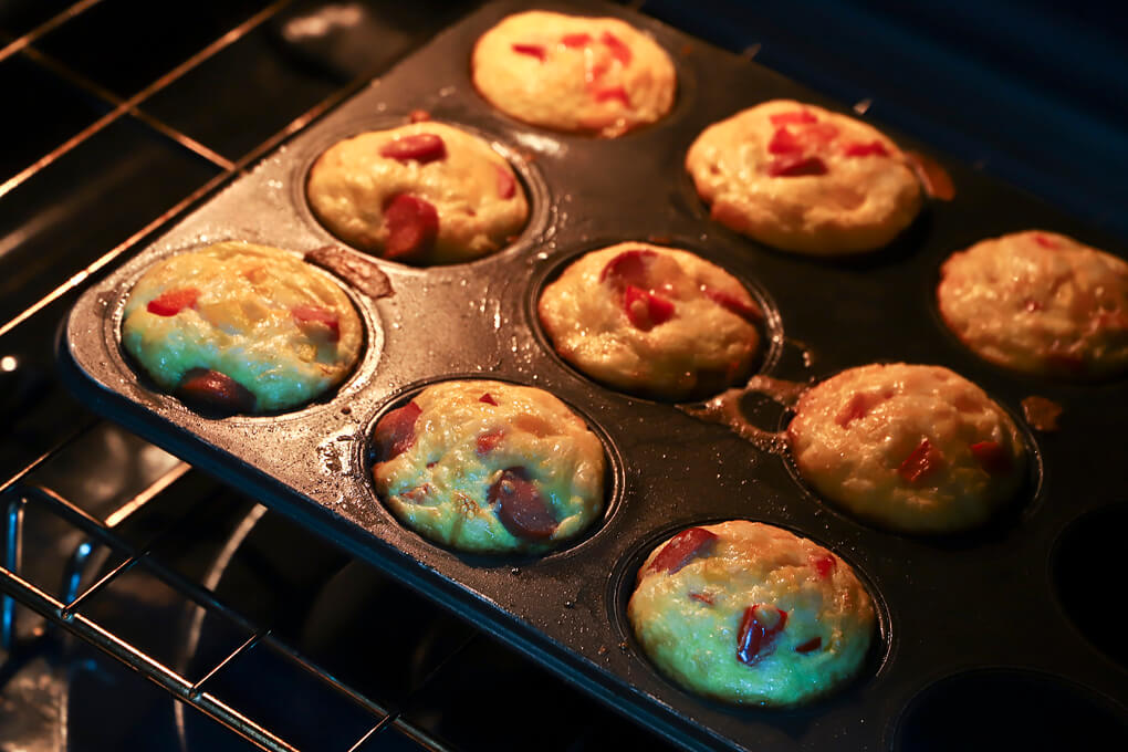 - En moldes de cupcakes, previamente engrasados, verter la mezcla y poner en el horno durante 8 minutos o hasta que esté sólido y derretido los quesos. Servir.