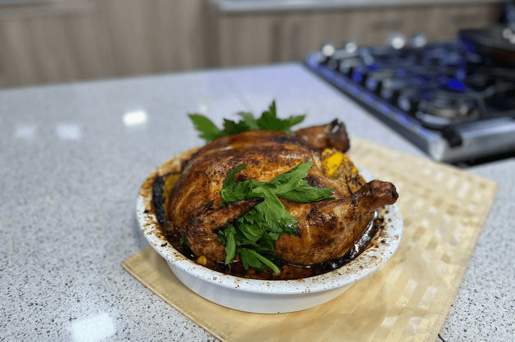 - Para hornear: ingresa el pollo relleno dentro del horno con las pechugas viendo hacia abajo durante 1 hora y 30 minutos (durante este tiempo, realizar baños al pollo con sus propios líquidos – procurar realizar este proceso fuera del horno, para evitar perder temperatura del mismo y que no afecte el producto final); luego, girar el pollo de manera que las pechugas vean hacia arriba y hornear durante 1 hora y 30 minutos (repitiendo el mismo proceso del baño con sus propios jugos cada 30 minutos). Retirar del horno, reposar durante 5 minutos, y verificamos temperatura interior al hueso que marque 185°F/82°C ; cuando indique esta temperatura, dejar reposar el pollo durante 10 minutos más antes de partirlo.