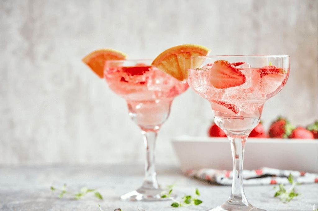 - En cada vaso colocar trozos de fresa y hielo, verter el trago y servir decorados con trozos de toronja y fresas.