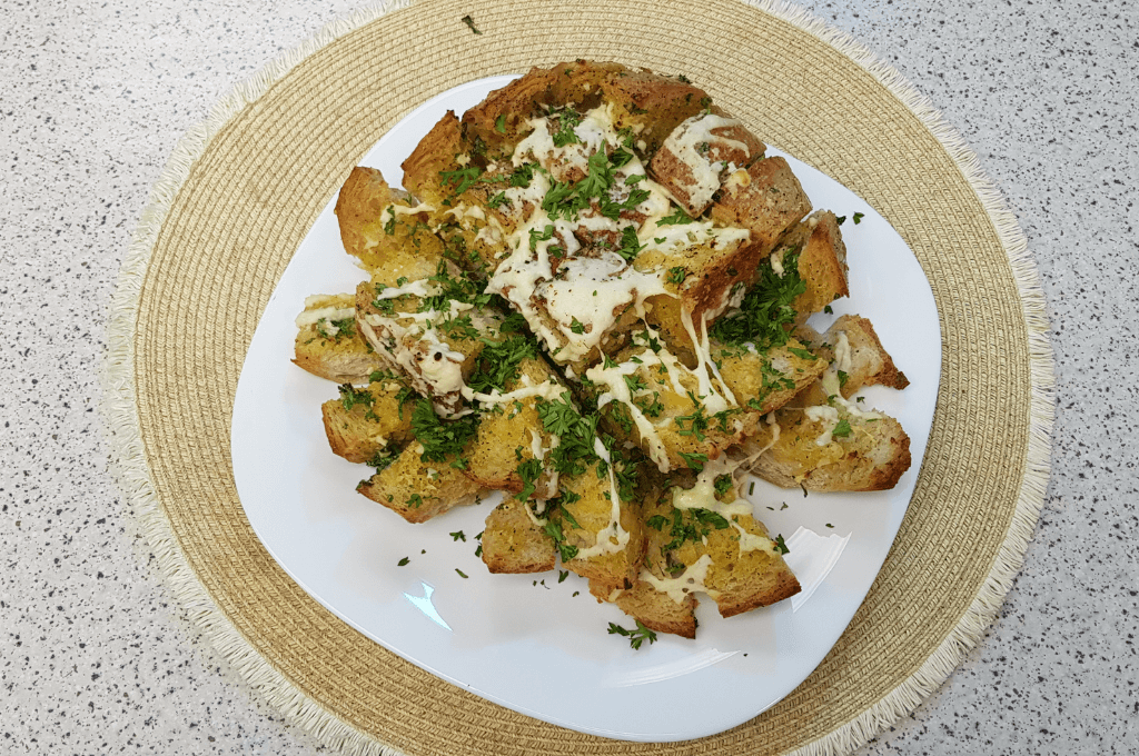 La clave del éxito de este plato es servir el pan bien calentito y dejarlo en el medio de la mesa para que todos los comensales puedan coger un trozo. Así, al degustar notarán en su paladar un mundo de sabores y texturas delicioso: el crujiente del pan, la cremosidad de la miga, el sabor del ajo y el perejil. Puedes enriquecer este plato con pimientos rojos, cebolla, champiñones… Pícalos muy finitos y espárcelos por encima del pan. Será un plato que recordarán durante mucho tiempo.