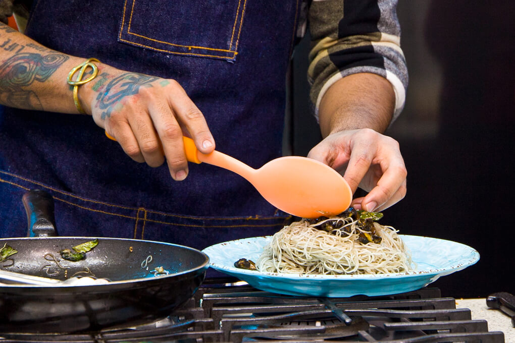 Los curiles suelen utilizarse para preparar cocteles sin embargo el chef Espinal nos presenta esta propuesta para incorporarlo a la pasta de arroz junto al resto de ingredientes como el vino blanco.