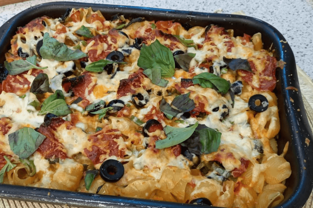 Puedes servir la pasta pizza, con una ensalada. ¡Una cena o almuerzo fácil para toda la familia y rápida de preparar! Esta cazuela de pizza es una de esas recetas que es excelente cuando tienes poco tiempo y paciencia, pero aún quieres algo caliente y reconfortante. Produce una cantidad generosa y es bastante económica, así que esa es otra ventaja.