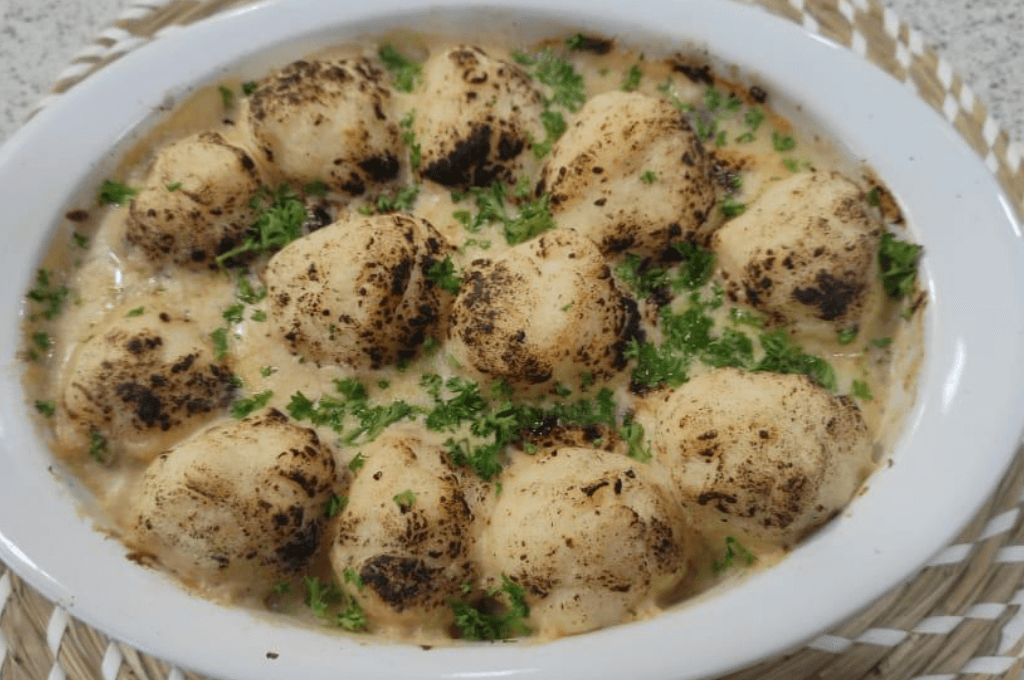 - Sobre la bandeja donde se colocó el mix de pollo, rociar ½ taza queso mozzarella y encima colocar las pelotas formada de puré de papa. Hornear destapado durante 30 minutos. Retirar, agregar más perejil picado y servir.