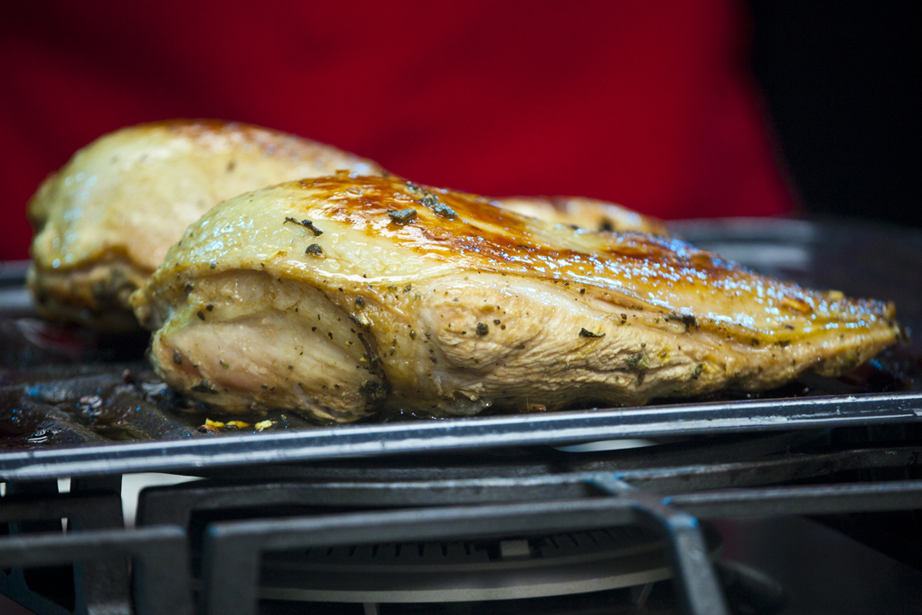 - Hornear por 25 minutos y bajar la temperatura a 375 ºF. Hornear por 30 minutos más o hasta que estén doradas las pechugas. Servir.