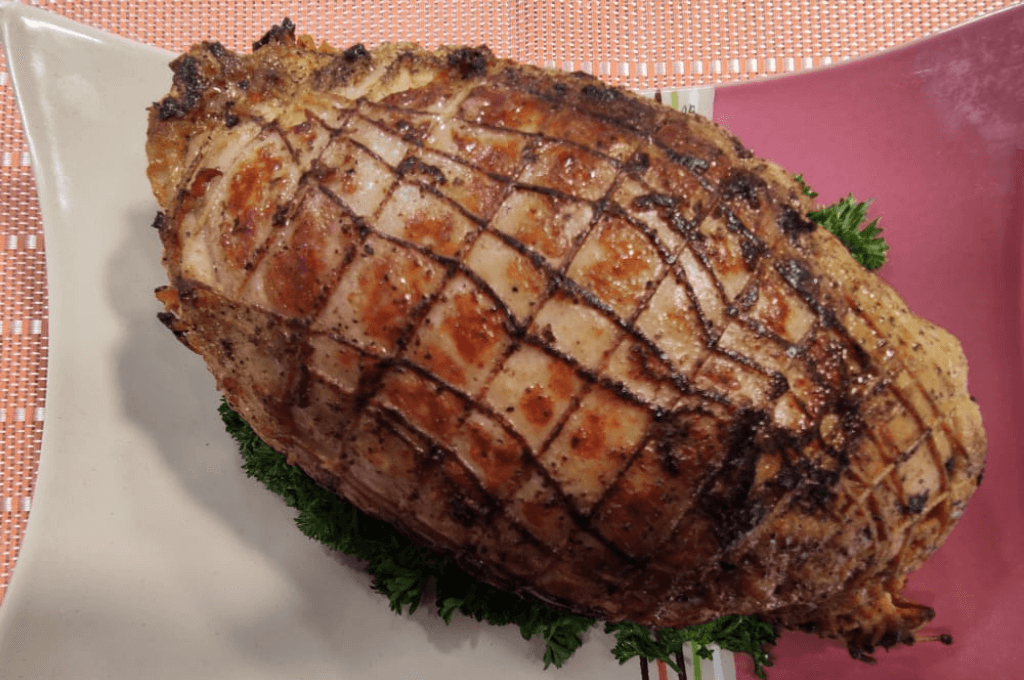 - Precalentar el horno a 425ºF. Retirar la pechuga del marinado, colocar el relleno preparado de vegetales, volver a enrollar y a colocar dentro de la red donde viene colocado y sellar a fuego alto por 3 minutos por lado y trasladar al horno por 40 minutos, retirar y dejar reposar por 10 minutos antes de cortar y servir.